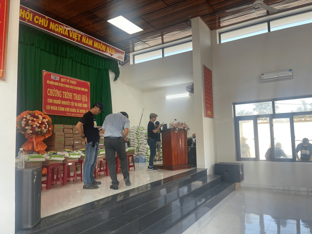 Cái hội trường được chuẩn bị khá nghiêm túc nào là bande rone, loa micro, bục phát biểu,.. các bạn học sinh khó khăn cùng bà con trong xã đã ngồi chật cả hội tường khi tụi nó đến. Hàng từ thiện đã đến trụ sở và các anh, chị, em, già trẻ, lớn bé xắn tay áo, nhào vô cùng chuyển vào sân khấu của hội trường. Lần này là lần thứ 3 nó tham dự, nên sự phân công theo nhóm của các bạn đã rõ ràng giúp công việc nhanh chóng vào nề nếp.