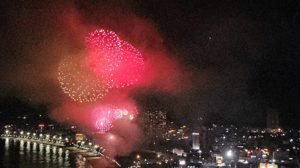 Trên đường về từ Đà Nẵng về Quy nhơn trở lại khách sạn Grand Hyam, khung cảnh con đường đã thay đổi rất nhiều, Từ một con đường ven biển đông đúc vừa phải đã trở thành một con đường không khác cái khu Nguyễn Huệ trong Saigon cuối tuần. Bỏ được cái xe vô trong bãi thì trời cũng tối mịt rồi. Nhà nó thả bộ ra khu bán thức ăn đường phố, nem rán và bún chả kèm 3 ly nước mía to đùng là đủ cho cái gia đình nó vui rồi, chỉ tiếc là không thưởng thức cái món mắt cá ngừ trong thố nổi tiếng thơm ngon ở đây. Hẹn lần khác vậy. Trên đường về Quy nhơn gia đình Nhật – Oanh lại có trải nghiệm khác khi con ngựa 4 bánh sổ mũi và phải leo lên xe lửa để về nhà. Con chó con nhà mình lại có cơ hội ở phòng riêng một mình khi chủ tịch xếp cho nó tận dụng cái phòng của gia đình Nhật. Đêm đó Quy nhơn bắn pháo hoa, phòng nó nằm ngay tầm mấy viên pháo nổ nên nó có một đêm ngủ mơ màng trong nhiều sắc màu của các viên pháo.Cuộc vui nào cũng tàn sáng hôm sau là đến lúc phải chia tay một chuyến đi, chia tay một hành trình. Đêm của ngày về nó còn phải dự một đám cưới của một cháu gái, là con của một cô bạn thân bà xã, con bé phải lấy chồng xa nên cả nhà nó cũng muốn gặp cháu trước khi bé đi xa.